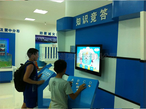 (十一)地震知識(shí)搶答(2人) 綜述: 本展項(xiàng)是運(yùn)用知識(shí)搶答這種方式讓學(xué)生在參與和競(jìng)爭(zhēng)游戲中學(xué)習(xí)地震知識(shí),增加學(xué)習(xí)的趣味。本展項(xiàng)是變枯燥的科普知識(shí)為生動(dòng)形象的“實(shí)體”,讓學(xué)生在快樂(lè)中接受。展品2人參與,多人觀看。 1.性能要求 1.1觀眾通過(guò)搶答方式選擇試題答案,系統(tǒng)判斷答案的對(duì)錯(cuò)并作出相應(yīng)的提示。 1.2 搶答臺(tái)由兩個(gè)搶答終端組成,每個(gè)搶答終端臺(tái)面是圓形,上有兩個(gè)觸摸區(qū)域,分別代表ABCD四個(gè)答案,觀眾觸摸來(lái)?yè)尨稹o@示器顯示系統(tǒng)判斷答案的對(duì)錯(cuò)。 2.配置要求: 2.1計(jì)算機(jī)系統(tǒng):聯(lián)想啟天M4360 1臺(tái) 配置:cpu:Intel G2030、內(nèi)存:2G DDRIII、硬盤(pán):500G。 2.2 顯示系統(tǒng):創(chuàng)維46寸液晶電視機(jī) 1臺(tái) 屏幕尺寸:46英寸,屏幕比例:16:9,分辨率:1920×1080,支持格式:1080p(全高清),音效系統(tǒng):SRS虛擬環(huán)繞內(nèi)置道數(shù)字音響。 2.3 搶答終端 2套 2.4材料要求: 高分子復(fù)合材料, 鐵管 Q235,有機(jī)板,木工板。 3.技術(shù)參數(shù) 3.1 展品尺寸1.2m (長(zhǎng))×2.0m(寬)× 2.4m(高) 3.2凈占地面積:2.4㎡ 3.3 電源: 單相220V 1KW.